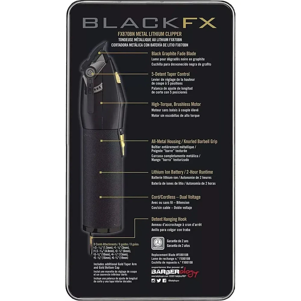 The BaBylissPRO BLACKFX Cordless Clipper from the Metal Collection offers cutting-edge technology and superior performance for professional barbers and stylists. With a high-torque, brushless motor, this cordless clipper ensures precision cutting with minimal effort, providing smooth, clean cuts every time. The FX870BN features an all-metal housing for durability and a sleek, modern design, making it as stylish as it is functional. Its adjustable blade and powerful motor offer versatility for all hair types, and the cordless design allows for easy maneuverability. Perfect for use in a salon or barber shop, the BaBylissPRO BLACKFX is engineered for professionals who demand the best in both performance and design.