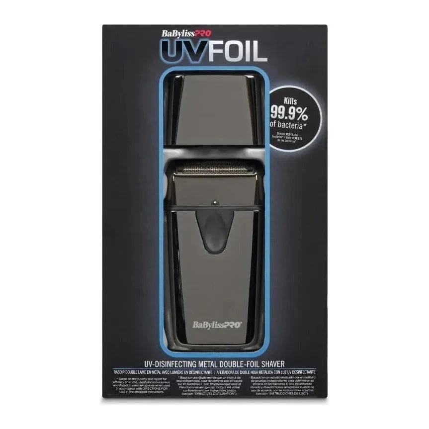 The BaBylissPRO® UVFoil UV-Disinfecting Metal Double-Foil Shaver (Model FXLFS2) combines professional-level shaving performance with cutting-edge sanitation technology. Featuring metal double-foil blades, this shaver delivers a close, smooth shave with reduced irritation. The UV sanitation system effectively sterilizes the foils between uses, ensuring a hygienic grooming experience every time. Perfect for barbers, stylists, and personal use, the UVFoil shaver provides precision, convenience, and cleanliness all in one. Its sleek design and ergonomic build ensure comfortable handling for easy, efficient use.