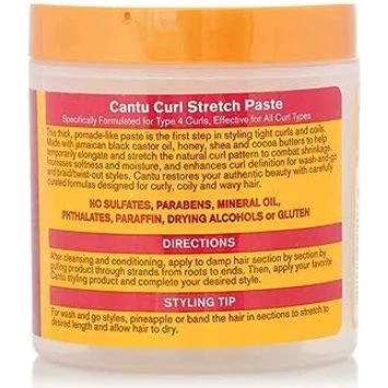 Cantu’s Curl Stretch Paste is a thick, pomade-like paste and the first step in styling tight curls and coils to be layered with other popular Cantu styling aids. Made with jamaican black castor oil, honey, and a blend of shea and cocoa butters to temporarily elongate and stretch the natural curl pattern to combat shrinkage. Increases softness and moisture, and enhances curl definition for wash-and-go and braid/twist-out styles. Styling Tip: For wash and go styles, pineapple or band the hair in sections to stretch to desired length and allow hair to dry.