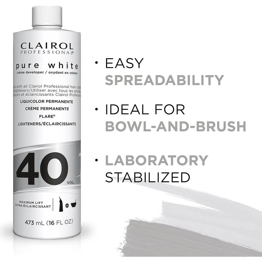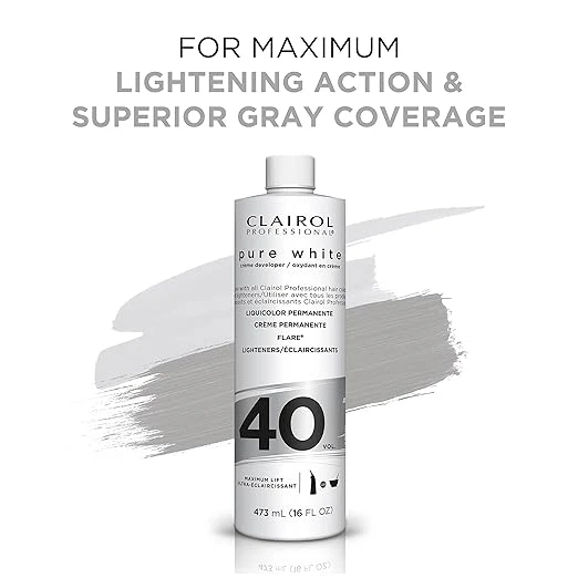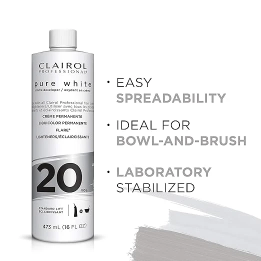 Achieve salon-quality results with Clairol Professional Pure White Creme Developer, available in 10, 20, 30, and 40 volume options. This professional-grade developer is ideal for use with permanent hair color and lighteners, providing consistent, reliable results with smooth application.