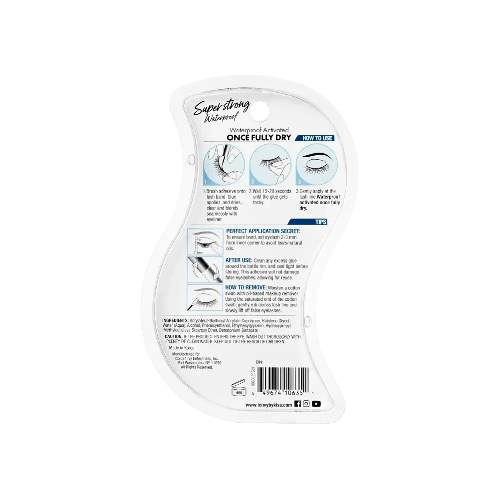 Achieve all-day lash security with iEnvy by Kiss Super Strong Waterproof Clear Lash Glue. Designed for maximum hold, this lash adhesive is formaldehyde- and latex-free, making it ideal for sensitive eyes. The waterproof formula ensures your lashes stay put through heat, humidity, and long wear. Dries clear for a seamless, natural finish. Perfect for strip and individual lashes.