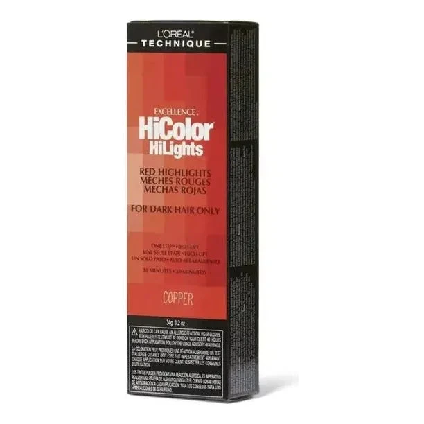 L’Oreal Excellence HiColor HiLights Permanent Creme HiLighting for dark hair lifts 3-4 levels with no pre-lightening required. For highly-visible, intense red highlights even on dark hair, without the brassiness, breakthrough technology lifts hair 3-4 levels, no pre-lightening required, Rich, no-drip creme makes it easy for control of creative techniques. It’s True-to-shade color that resists fading and Quick processing time of only thirty minutes.